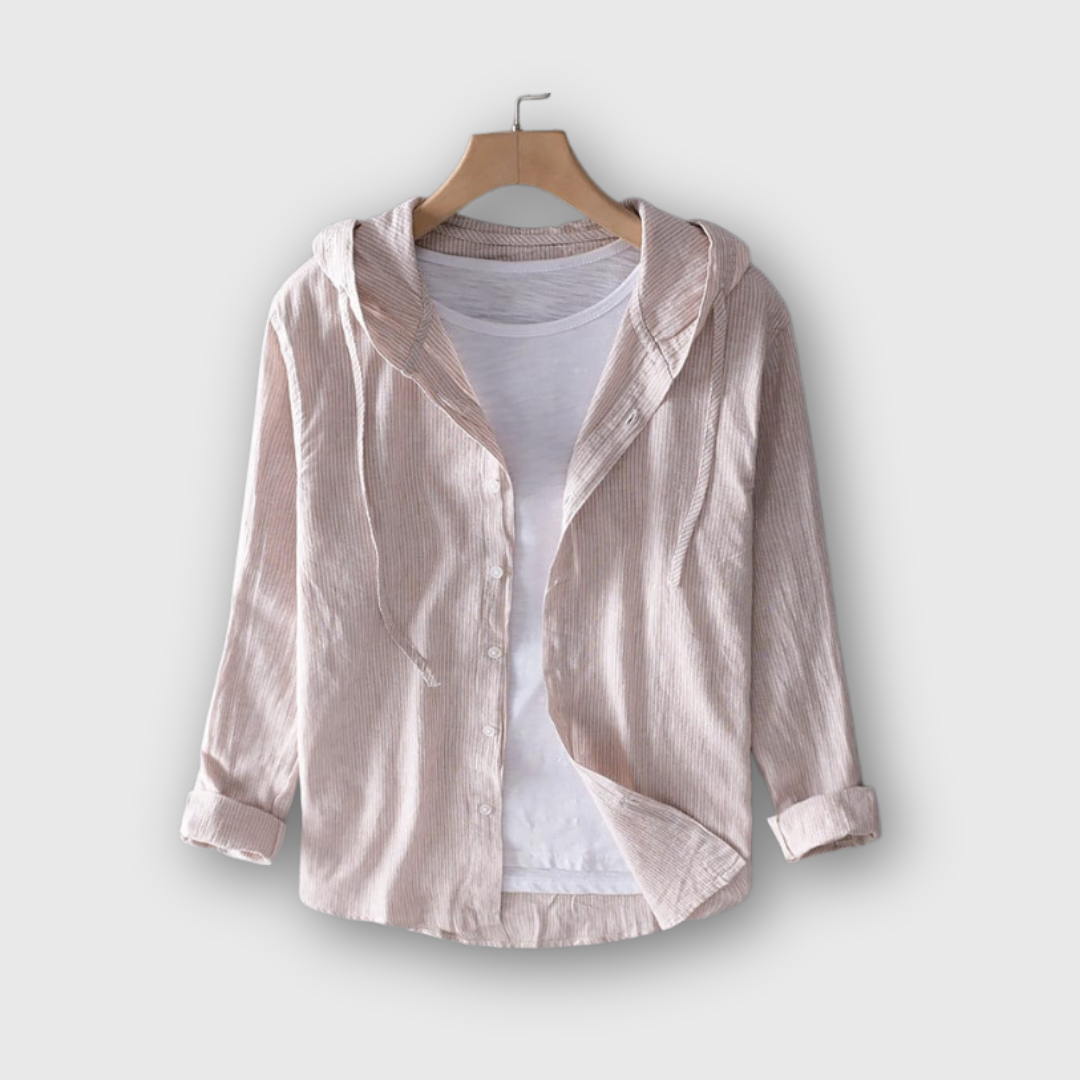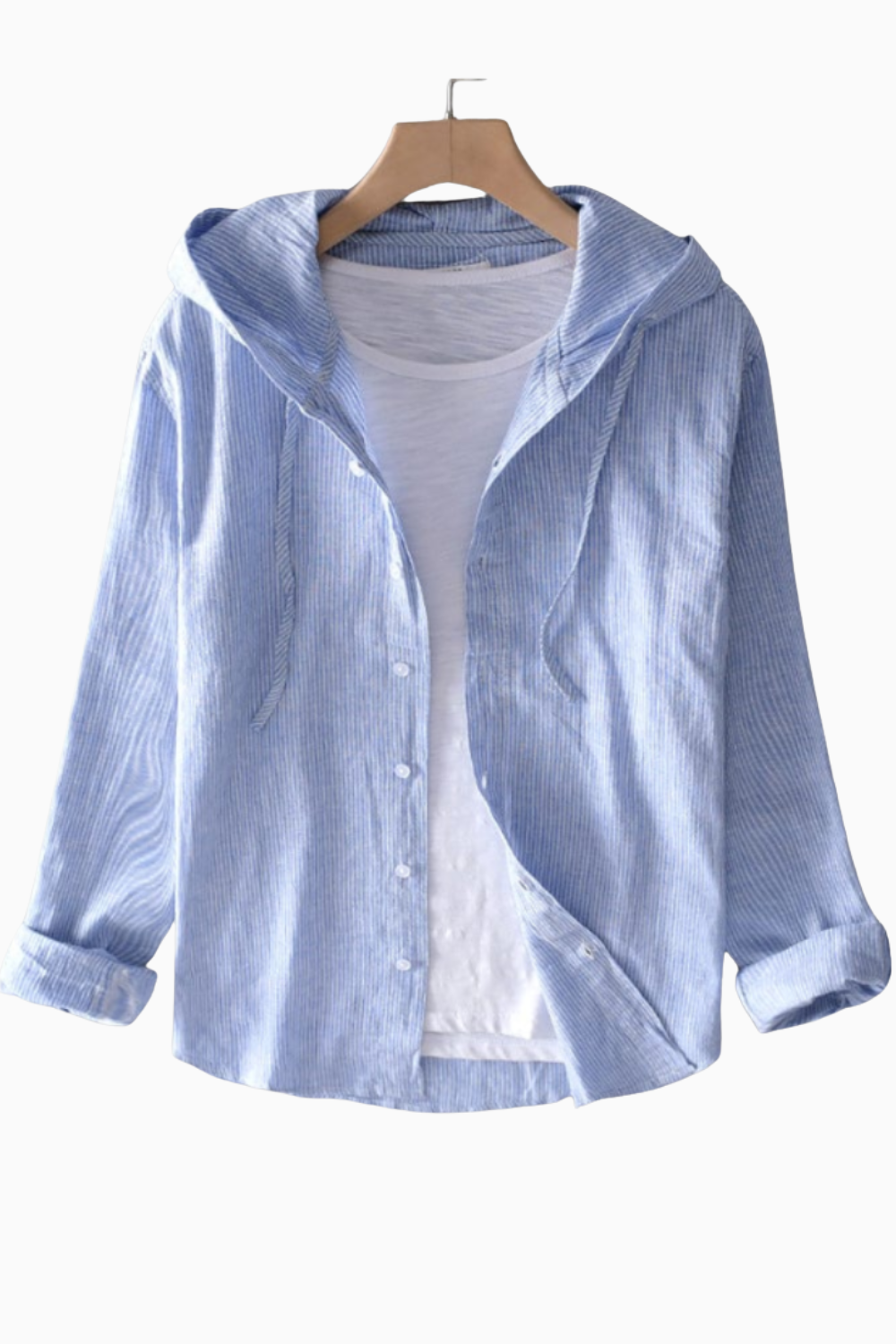 Crafted from a premium linen-cotton blend, Zion offers lightweight breathability and a naturally soft texture that keeps you cool and comfortable. The striped pattern adds a touch of casual polish, while the hooded design with adjustable drawstrings introduces a modern, laid-back twist. Whether worn open over a tee or buttoned up for a sharper edge, this piece adapts seamlessly to your plans.